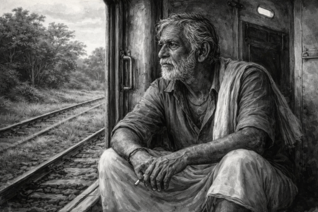சிறிது நேரம் அவர்கள் இருவரும் ஏதோ பேசிக்கொண்டனர். தன்னை பற்றித் தான் ஏதோ பேசிக்கொள்கிறார்கள் என்று நினைத்து அவர்களையே பார்த்துக்கொண்டிருந்தார் அகிலாண்டம். குடிசையிலிருந்து முக்காடிட்ட அப்பெண்மணி வெளியே வந்து அகிலாண்டத்திடம் ஒரு சிறு துணி மூட்டையை அவர் கையில் கொடுக்க, அவருக்கு ஏதும் புரியாமல் அவளிடமிருந்து வாங்கி என்ன செய்வதென்று அவர்களைப் பார்த்தார். அம்மூட்டைச் சற்று வெம்மையாக இருக்க, அதனை முகர்ந்து பார்த்தார். சப்பாத்தியின் வாசனை அடித்தது. அவர்கள் இருவரும் எழுந்து அகிலாண்டத்தை தங்களுடன் வருமாறு அழைத்துச் சென்றார்கள். அகிலாண்டம் எழுந்து அப்பெண்மணியை நோக்கித் திரும்பி, தயங்கி நின்று விட்டு அவர்களுடன் சென்றார். அவர்கள் குறுக்கு வழிப் பாதையைப் போல இருந்த புதர்கள் மண்டிய வழியே சென்றுகொண்டே இருந்தனர். அகிலாண்டம் திரும்பி தூரத்திலிருந்த அவ்வீட்டைப் பார்த்தார். அச்சிறுமி குடிசையின் தூணில் சாய்ந்துகொண்டு அவர்கள் போவதையே பார்த்துக்கொண்டிருந்தாள். சிறிது நேர நடைக்குப்பின் ஆளுயர புதர்கள் படர்ந்திருந்த பகுதிக்கு வந்தார்கள். அகிலாண்டம் சற்று தூரத்தில் குறுக்காகப் பளபளத்துச் செல்லும் தண்ட வளாகங்களைப் பார்த்தார். சில மாதத்திற்கு முன் இரவில் கண்ட அந்த இடம் இப்போது அவருக்கு வேறொன்றாக இருப்பது போலப் பட்டது. மூவரும் புதர்கள் மண்டியிருந்த மறைவில் அமர்ந்துகொண்டனர். மீசைக்காரரும், அவர் நண்பரும் அவர்களின் தலைப்பாகையைக் கழட்டி கீழே வைத்துவிட்டு, ஏதேதோ பேசிக்கொண்டிருந்தனர். சற்று நேரம் வரை சிரித்து மகிழ்ந்திருந்த அகிலாண்டத்தின் முகம் இருளடைந்து மாறியதைக் கண்டு அவர்களும் அமைதியாகி அவரையே பார்த்துக்கொண்டிருந்தனர். பின், வெகு நேரம் அவர்கள் ஏதும் பேசிக்கொள்ளாமல் ஏதோ யோசனையில் அமர்ந்திருந்தனர். தொலைவில் ரயில் வரும் சத்தம் கேட்டு மீசைக்காரருடன் வந்தவர் எங்கோ சென்றார். வேகமாக வருவது போல இருந்த ரயில் சட்டெனப் பலமான இழுவையுடன் உராய்ந்து நின்றது. அவர்கள் இருவரும் அப்படியே அமர்ந்திருந்தார்கள். சிறிது நேரத்திற்குப் பின் யாரோ ஒருவர் ஒவ்வொரு பெட்டியாகப் பார்த்துவிட்டுத் திரும்பிச் செல்ல, மீசைக்காரர் சட்டென அகிலாண்டத்தை அழைத்துக்கொண்டு அந்த ரயில் பெட்டியின் அருகில் வந்து அதில் ஏறிக்கொள்ளச் சொன்னார். அகிலாண்டம் அதில் தொத்தி எரியப் பின், மீசைக்காரர் அவர் கையில் வைத்திருந்த துணி மூட்டையை அகிலாண்டத்திடம் கொடுத்துவிட்டு “கர் ஜாவ்..கர் ஜாவ்..” என்று சொல்லிக்கொண்டே புதர் மறைவில் நின்றுகொண்டார். ரயில் மெல்ல நகரக் கதவில் சாய்ந்துகொண்டு கீழே அமர்ந்துகொண்டு மீசைக்காரர் மறையும் வரை அவரையே ப